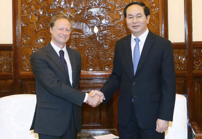 Ngày 1/6, tại Phủ Chủ tịch, Chủ tịch nước Trần Đại Quang đã tiếp Đại sứ Cuba Herminio López Díaz; Đại sứ, Trưởng phái đoàn Liên minh châu Âu (EU) tại Việt Nam Bruno Angelet tới chào xã giao. Trong ảnh: Chủ tịch nước Trần Đại Quang tiếp Đại sứ, Trưởng phái đoàn Liên minh châu Âu (EU) Bruno Angelet. Ảnh: Nhan Sáng - TTXVN