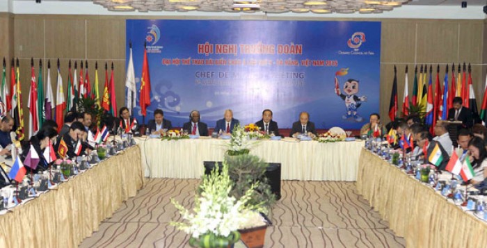 | Ngày 1/6, tại Đà Nẵng, Ban tổ chức Đại hội Thể thao bãi biễn châu Á lần thứ 5 (ABG5) tổ chức khai mạc Hội nghị Trưởng đoàn Đại hội Thể thao bãi biển châu Á lần thứ 5. Tham dự hội nghị có hơn 200 đại biểu của Hội đồng Olympic châu Á, các vị Trưởng đoàn từ 40 Uỷ ban Olympic quốc gia, vùng lãnh thổ châu Á. Sắp tới, Đại hội Thể thao bãi biển châu Á lần thứ 5 sẽ diễn ra tại Đà Nẵng; với thông điệp “Toả sáng đại dương, rực sáng tương lai”. Trong ảnh: Quang cảnh hội nghị. Ảnh: Trần Lâm – TTXVN |