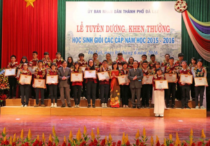 Ngày 1/6, UBND thành phố Đà Lạt (Lâm Đồng) tổ chức lễ tuyên dương, khen thưởng 623 học sinh giỏi, có thành tích xuất sắc trong năm học 2015 - 2016. Năm học vừa qua, Đà Lạt có hai em Hoàng Lữ Đức Chính, Nguyễn Thu Minh Châu đạt giải 3 Hội thi Khoa học kỹ thuật quốc tế -Intel ISEF 2016; 31 học sinh đạt giải học sinh giỏi cấp quốc gia; 325 học sinh giỏi cấp tỉnh; 185 học sinh giỏi cấp thành phố và 52 học sinh xuất sắc toàn trường. Trong ảnh: Trao giấy khen cho các học sinh Đà Lạt có thành tích xuất sắc trong năm học 2015 - 2016. Ảnh: Nguyễn Dũng - TTXVN