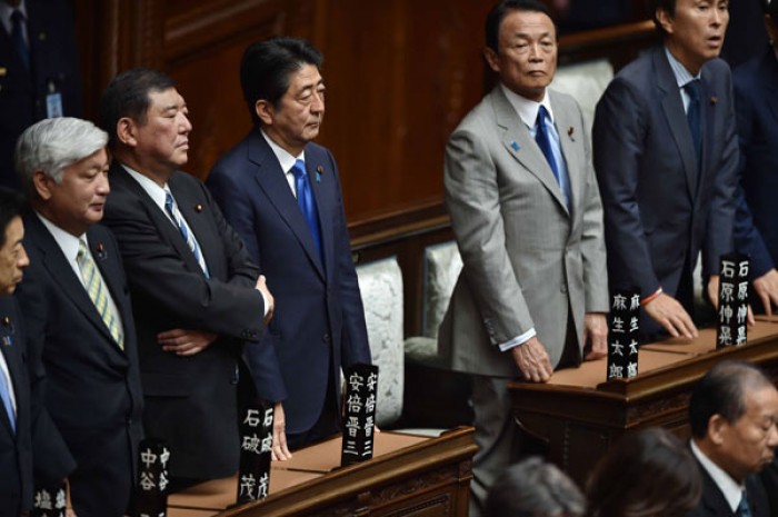 Hãng thông tấn Kyodo của Nhật Bản ngày 1/6 đưa tin Thủ tướng Nhật Bản Shinzo Abe sẽ công bố quyết định lùi thời điểm tăng thuế tiêu dùng từ 8% lên 10% thêm 2 năm rưỡi nữa (từ tháng 4/2017 đến tháng 10/2019). Quyết định trên được đưa ra trong bối cảnh tiêu dùng tư nhân của Nhật Bản suy giảm kể từ sau đợt tăng thuế tiêu dùng hồi tháng 4/2014 từ 3% lên 8%, khi Trung Quốc và các nền kinh tế mới nổi khác đang phải đối mặt với nguy cơ tăng trưởng chậm lại. Trong ảnh: Thủ tướng Nhật Bản Shinzo Abe (giữa) và các thành viên nội các tại phiên họp toàn thể của Hạ viện ở thủ đô Tokyo ngày 1/6. AFP/TTXVN