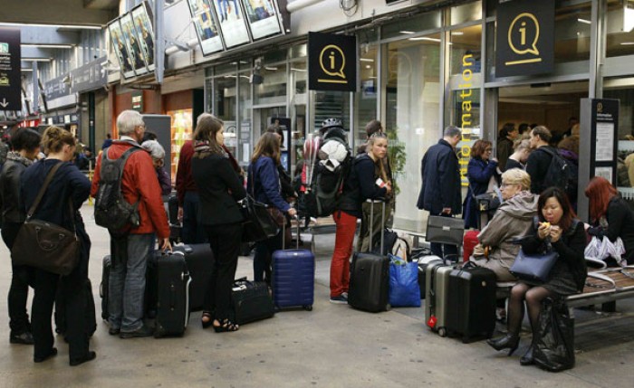 | Nhân viên ngành đường sắt Pháp ngày 31/5 đã bắt đầu cuộc đình công liên hoàn nhằm phản đối luật cải cách lao động mới. Cuộc đình công diễn ra chỉ 10 ngày trước lễ khai mạc EURO 2016 tại Pháp có thể khiến giao thông nước này tê liệt. Cuộc đình công đã gây ảnh hưởng đến một số dịch vụ vào tối cùng ngày, tuy nhiên trong ngày 1/6, khoảng một nửa các dịch vụ cấp quốc gia và khu vực dự kiến sẽ bị tê liệt. Các nhân viên tàu điện ngầm ở Paris cũng đang lên kế hoạch cho cuộc bãi công từ ngày 2/6 tới, trong khi phi công của Hãng hàng không Air France cũng cảnh báo sẽ tiến hành cuộc đình công dài hạn trong một vài tuần tới. Trong ảnh: Hành khách tại nhà ga tàu hỏa Gare Montparnasse ở thủ đô Paris, Pháp ngày 31/5. AFP/TTXVN |