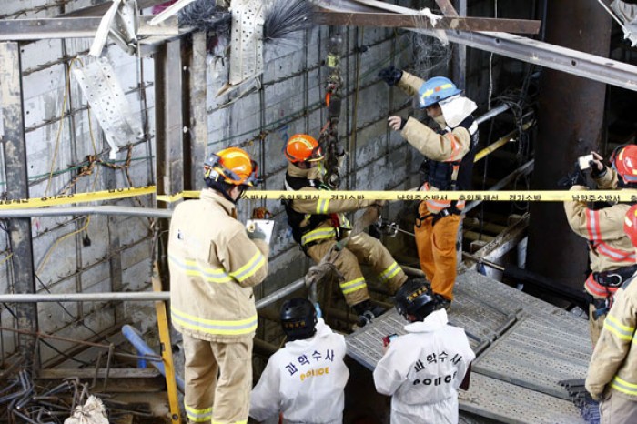 Truyền thông Hàn Quốc đưa tin, sáng 1/6, ít nhất 4 người đã thiệt mạng và 10 người bị thương trong vụ sập tại công trình xây dựng tàu điện ngầm ở thành phố Namyangju, phía đông thủ đô Seoul nước này. Vào thời điểm tai nạn xảy ra, có 17 công nhân làm việc gần hiện trường. Nguyên nhân tai nạn được cho là do nổ xi lanh ô-xi trong quá trình hàn. Công tác cứu hộ đang được tiến hành khẩn trương. Trong ảnh: Lực lượng cứu hộ làm nhiệm vụ tại hiện trường sự cố. EPA/TTXVN