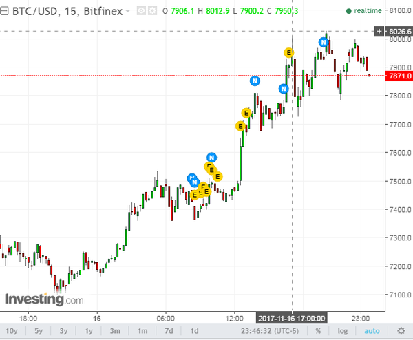Ngày 16/11, tại Sàn giao dịch Bitfinex, đồng bitcoin chính thức vượt mức 8.020 USD. Đây là lần đầu tiên đồng tiền điện tử vượt mốc 8.000 USD mặc dù sau đó giá bitcoin giảm xuống còn 7.896 USD.